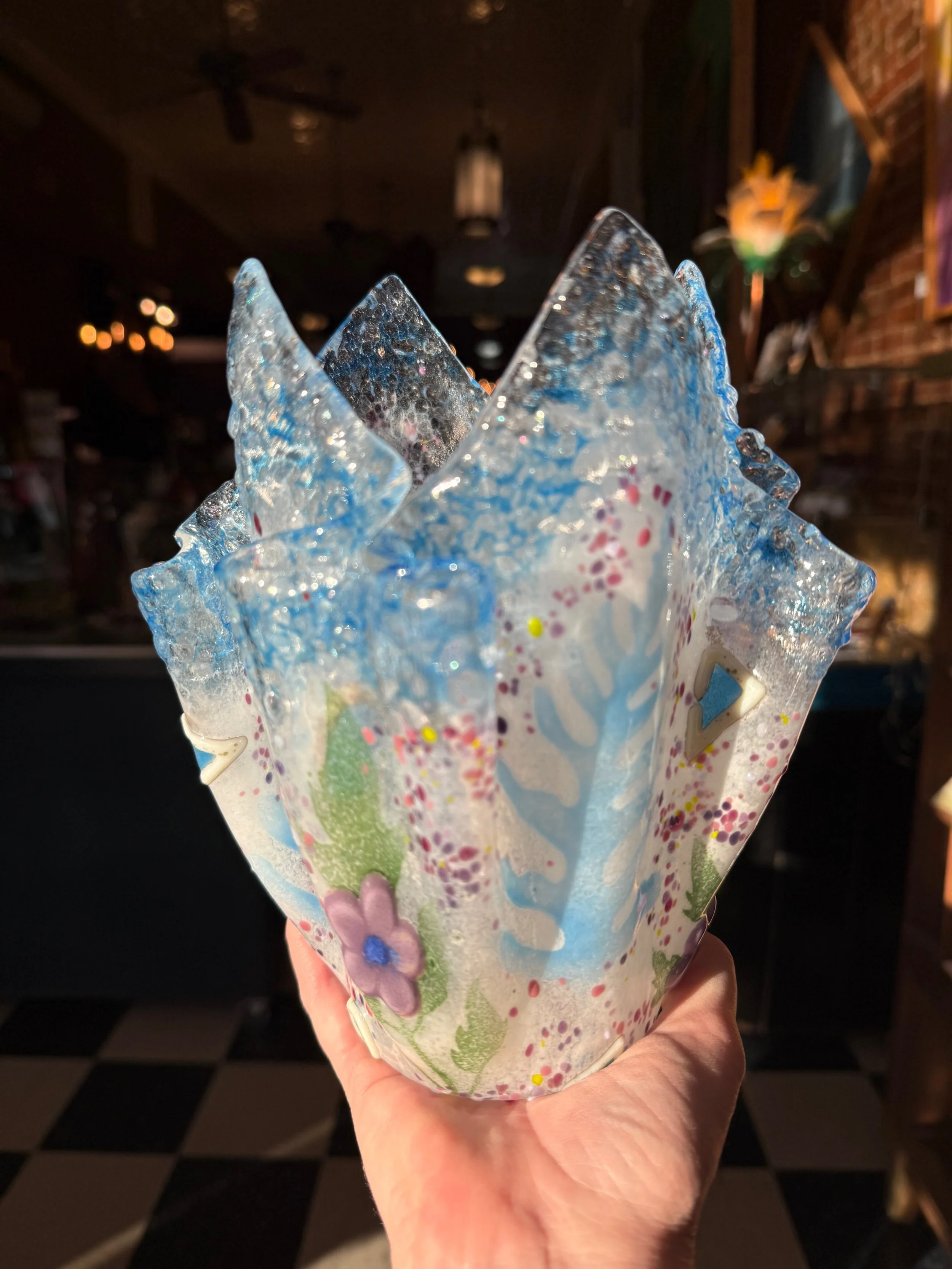 Many years later, I found a local college that offered stained glass classes and my journey continued. Then I found glass fusing, and the freedom it gave me was unbelievable, allowing me to create my own colors using glass powders. Working with these powders for the last 23 years, I have perfected techniques that allow me to create almost anything I can imagine. Fusing also requires a lot of science, and being self-taught in this medium, I have found that science always wins. I'm most known for my florals and seascapes which are influenced by my ocean roots and the beautiful area I live in now. My husband is my biggest fan and partner in this venture, and together, we do art fairs in the TN and KY area. My work is also in several galleries where I also teach classes.